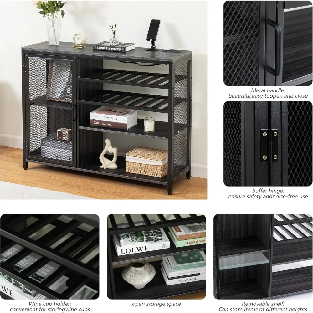- This bar sideboard has ample storage capabilities for wine enthusiasts looking to securely store bartending essentials and stemware in a well-organized space.