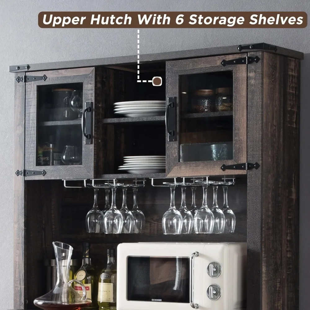 • Ample Storage Space: This kitchen cabinet composed of a buffet and upper hutch. The upper hutch has 2 open shelves and 4 shelves with glass door to provide large storage space while helping you find items easily. The bottom buffet has 6 shelves and 3 drawers allow you to classify kitchen utensils, jars, snacks, liquor orderly. The wide countertop is perfect to store microwave, coffee maker or whiskey. Each cabinet has adjustable shelves for flexible storage.