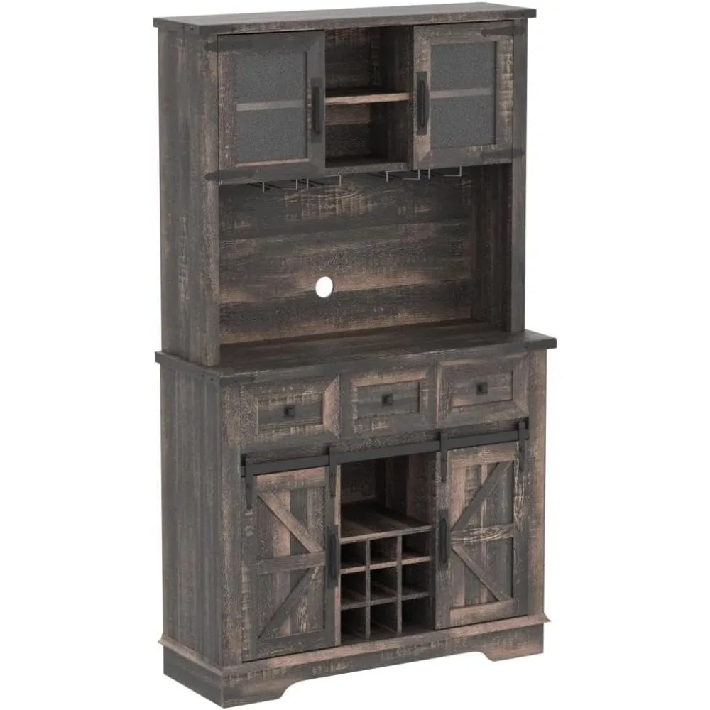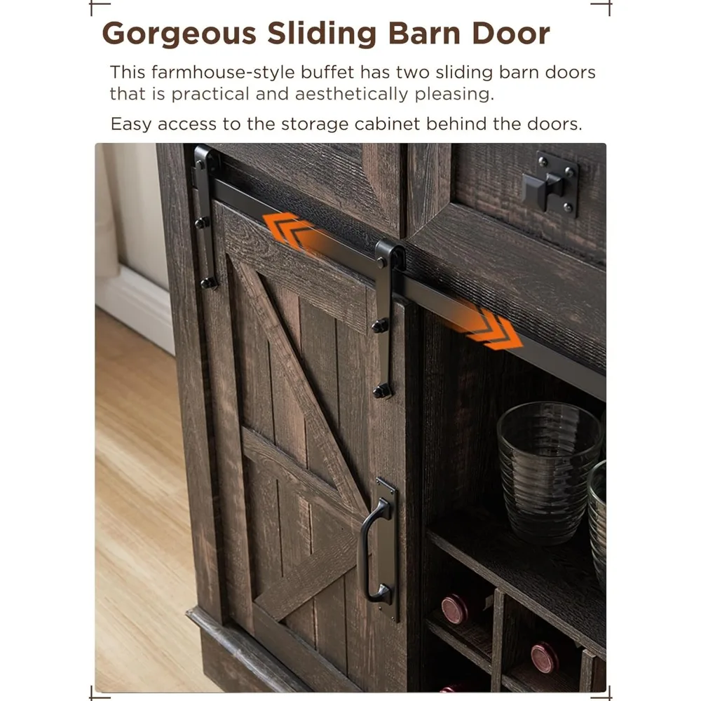 72″ Bar Cabinet with Sliding Barn Door, Large Kitchen Buffet with Hutch W/Wine & Glasses Rack, Coffee Bar Sideboard Table
