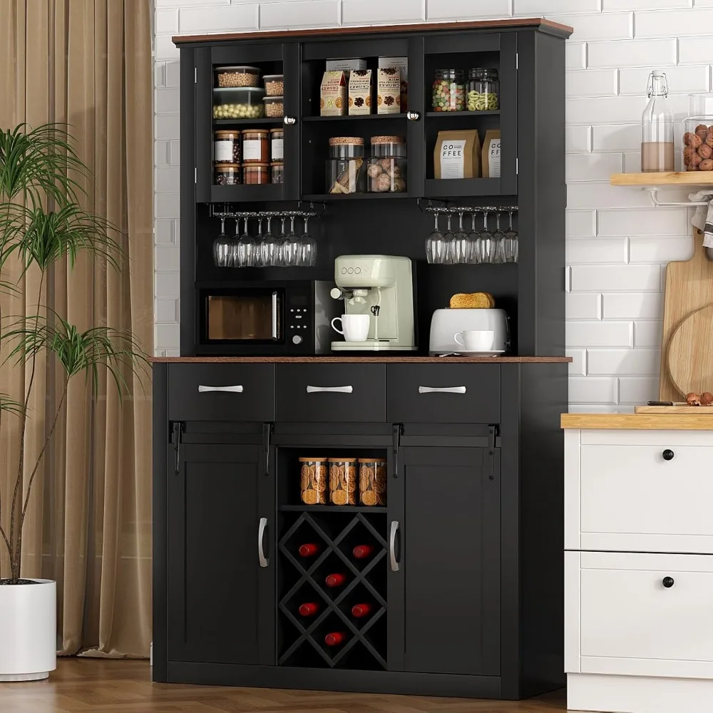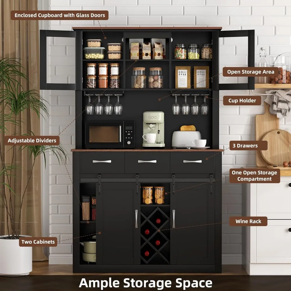 - 【AMPLE STORAGE SPACE】The farmhouse storage cabinet is a combination of a sideboard and an upper cabinet. The upper cabinet has 2 open shelves and 4 shelves with glass doors, which provide spacious storage space while helping you find items easily. In addition, the 3 drawers in the middle and the bottom cabinet provide additional space to store kitchen utensils. The powerful storage capacity of this cabinet ensures that everything you need is in order.