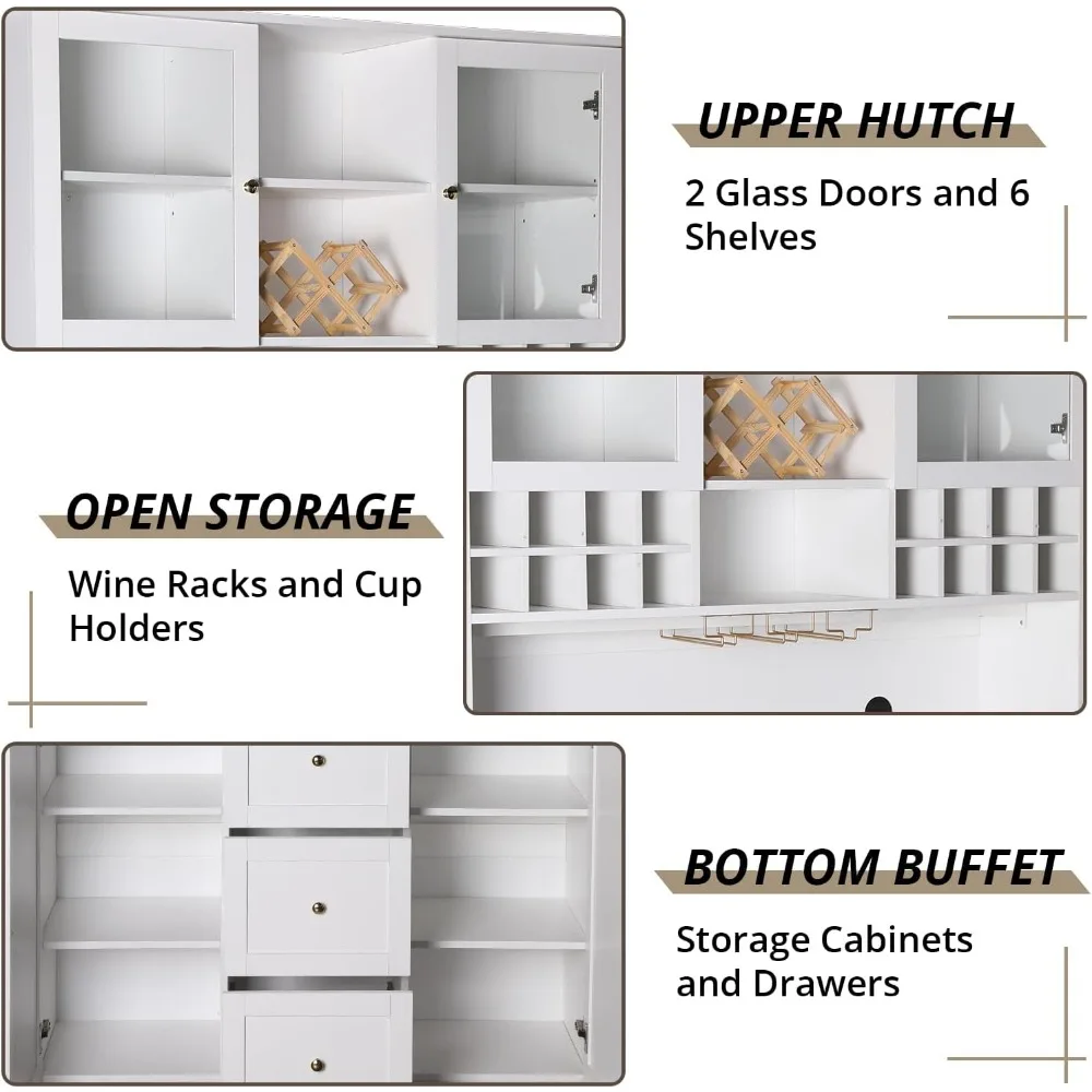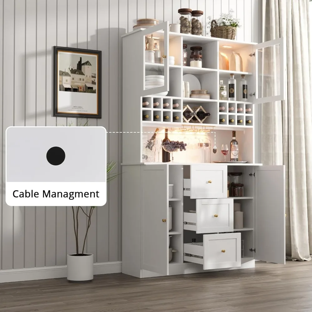 • 【Ample Storage Space】This bar cabinet consists of a lower storage cabinet and an upper cabinet. The upper cabinet has 2 glass door cabinets, 2 open shelves, and 3 wine rack areas, which provide spacious storage space while helping you find items easily. The bottom storage cabinet and the 3 drawers in the middle provide additional space to store kitchen utensils. The strong storage capacity ensures that everything you need is in order.