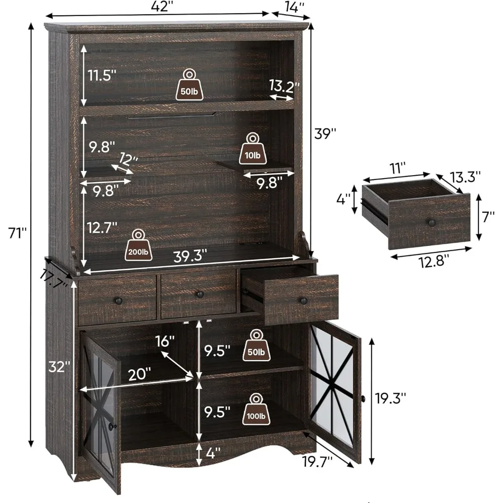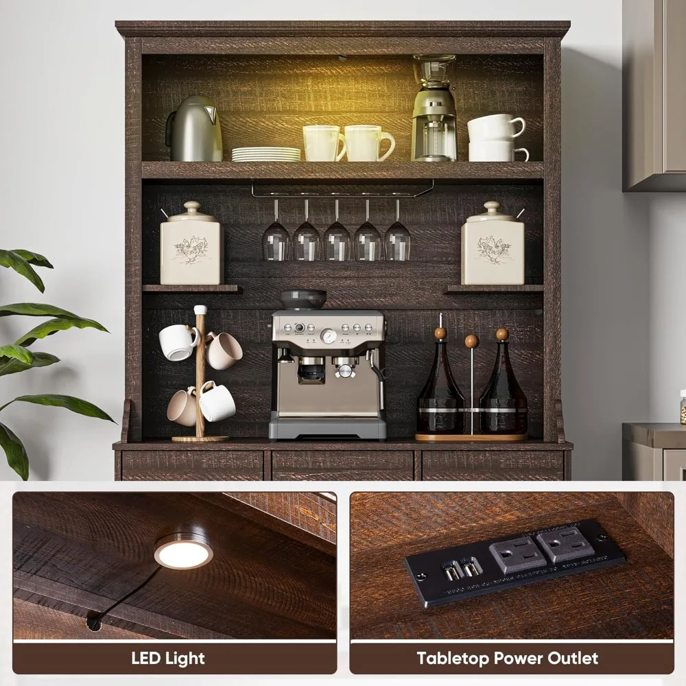 • DURABLE & STURDY: This kitchen hutch cabinet with outlet meets EPA and UL certification requirements. Crafted from exterior-grade MDF, it boasts exquisite workmanship and a robust structure, ensuring reliable stability for everyday use. Equipped with a 4.1-inch thicker reinforced bottom and anti-tip devices, it offers excellent stability and 200lbs load-bearing capacity, providing peace of mind.
