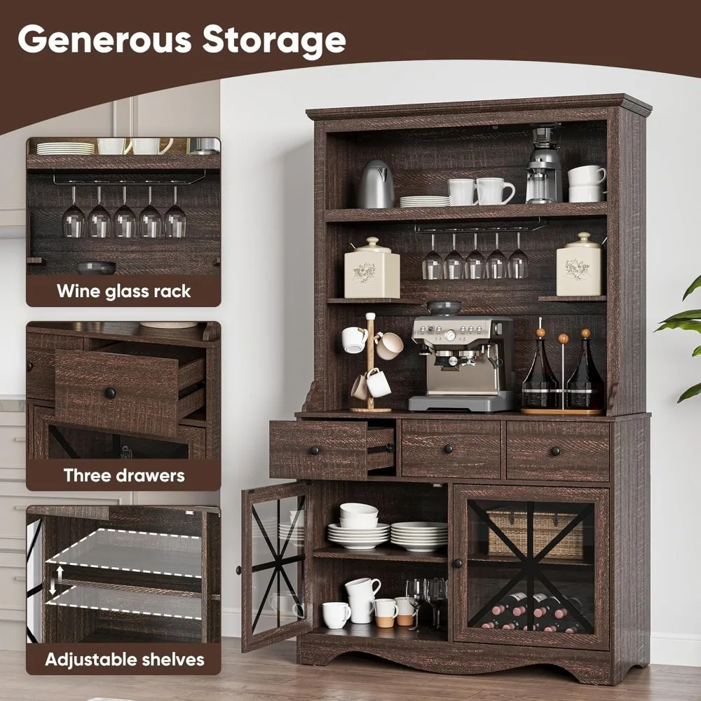 • AMPLE STORAGE: The tall pantry cabinet can help to create a tidy and organized home. 5 goblet holders for wine glasses and 2 display shelves can hold vases, photo frames. The 39” ultra-wide tabletop is ideal for coffee makers, microwaves and toasters. 3 handy drawers and 2 adjustable shelves can easily accommodate all kitchen utensils.