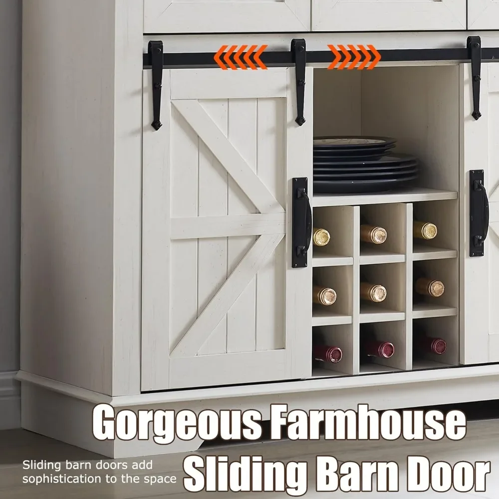 - 72 Inch Heightened body, exquisite sliding barn door system, and classical farmhouse elements make this farmhouse buffet table grand and gorgeous. What’s more, its rustic distressed finish is wonderfully easy on the eyes, and it has natural variations in grain, color, and texture, giving every piece a unique look, and adding a rustic, charming, cozy feel to the space.