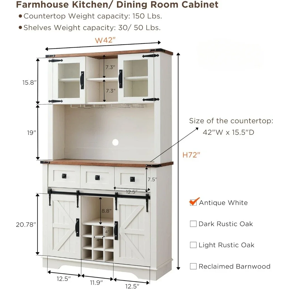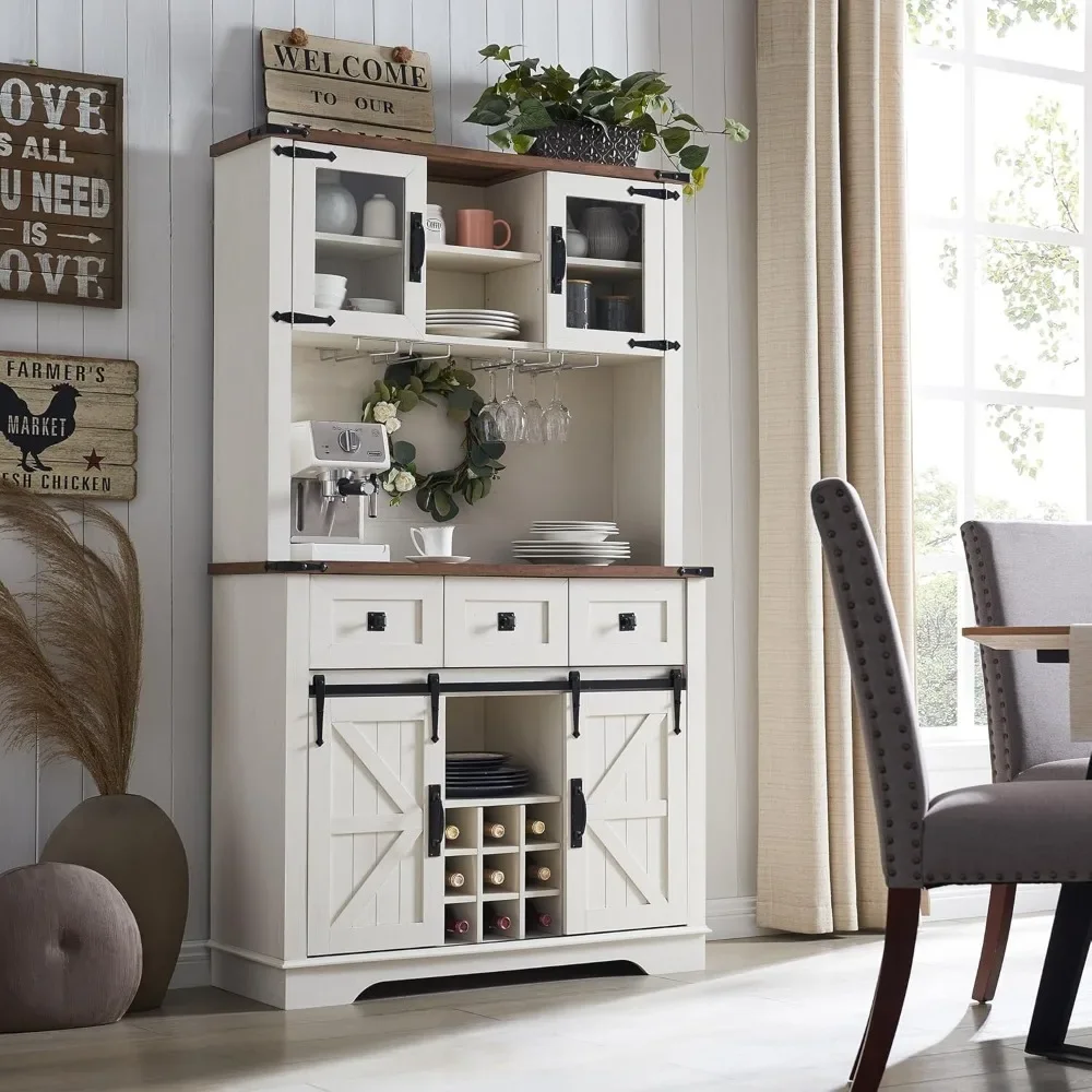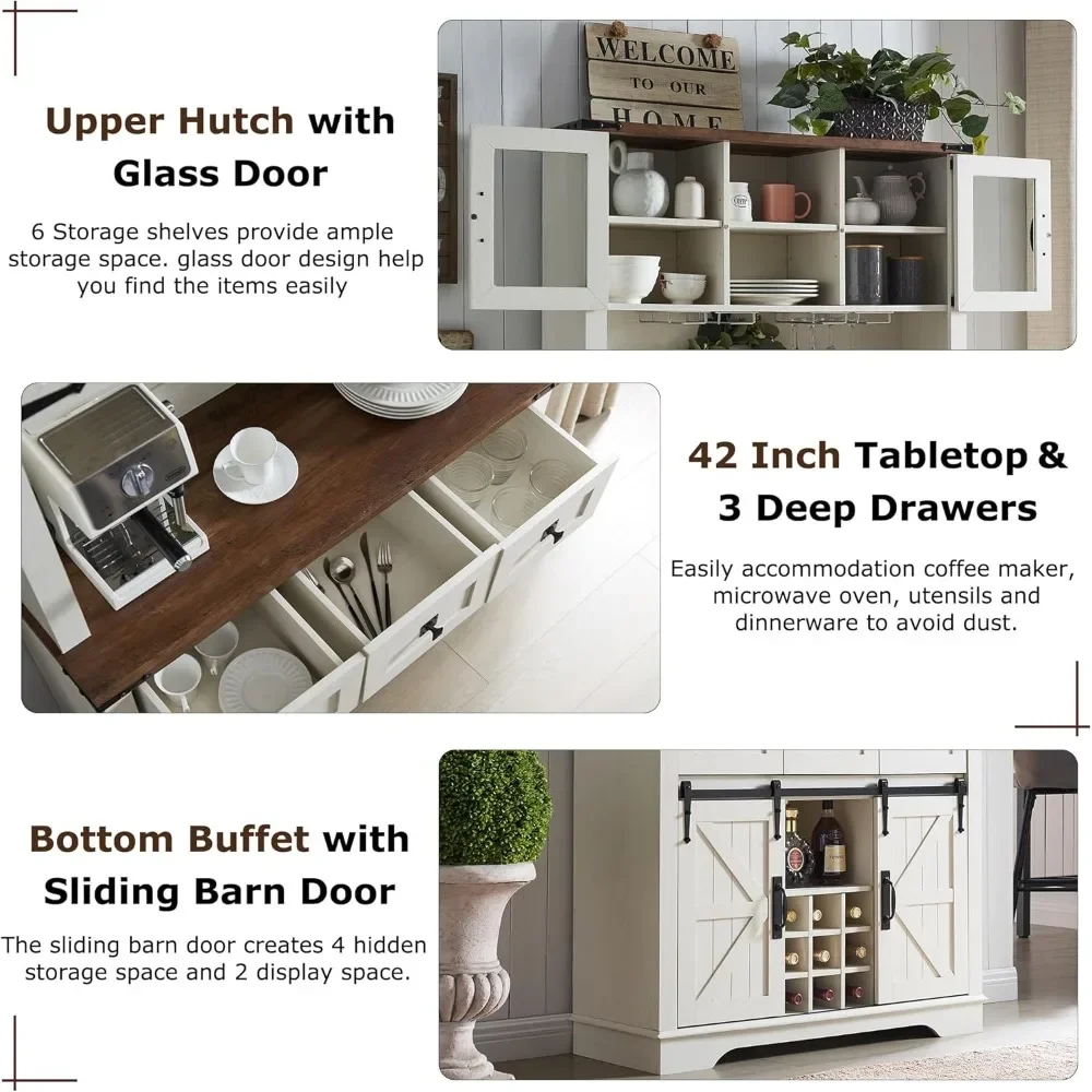 - The upper hutch has 2 open shelves and 4 shelves with glass doors to provide large storage space while helping you find items easily. The sliding barn doors add sophistication to your space and allow you to hide clutter behind the doors, keeping the room neat and organized. 42″ long Tabletop provides ample space to place your coffee maker and microwave oven.