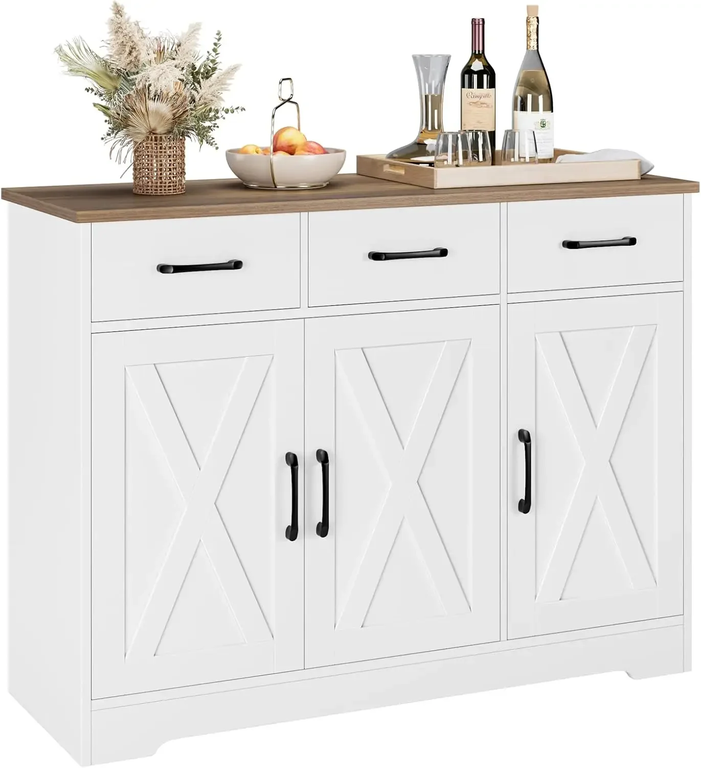 ✔ Spacious & Organized Storage – Combines open and closed storage options, including a spacious tabletop for décor, three smooth-glide drawers for utensils, and two large cabinets with adjustable shelving for dishware, mugs, or pantry items.