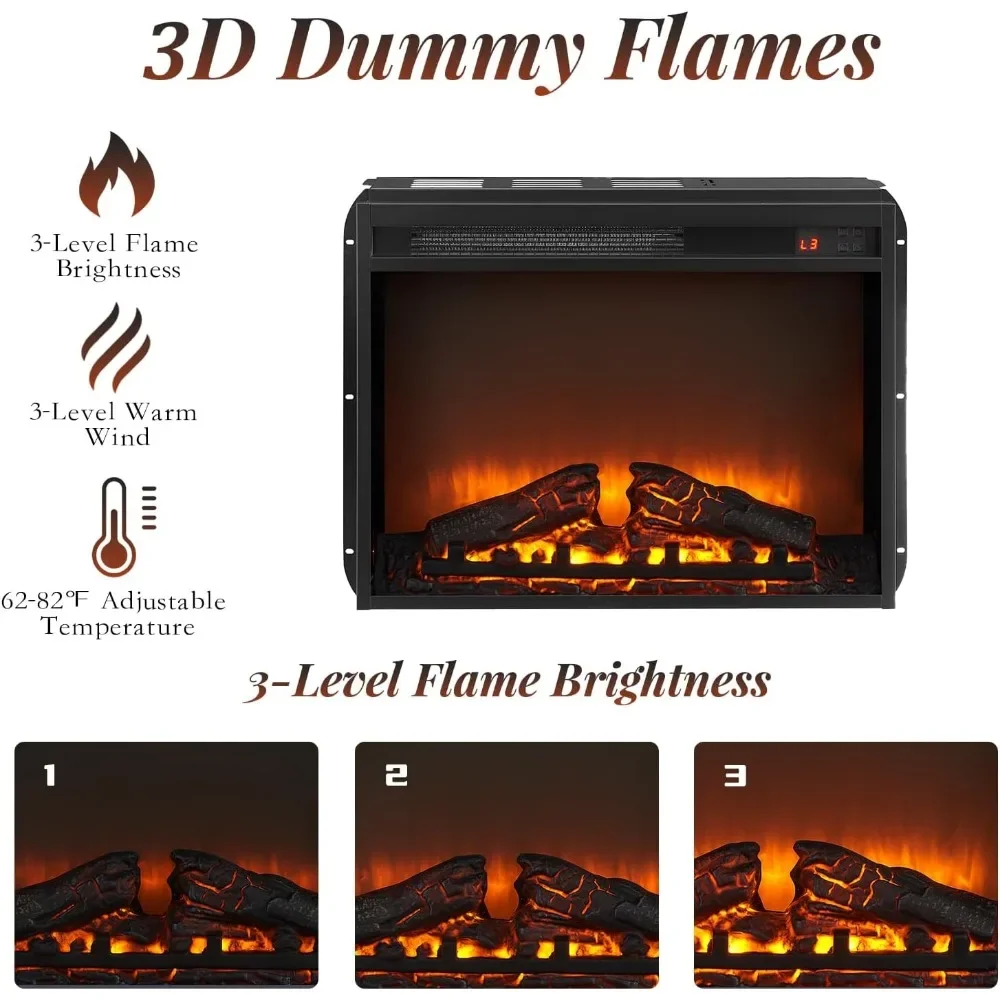• Smart Fireplace with Faux Flames: Includes faux logs and flames with four brightness levels, adjustable temperature (62°F to 82°F), and customizable warm air speed. An 8-hour timer automatically shuts off, conserving energy. Overheat protection ensures safe use