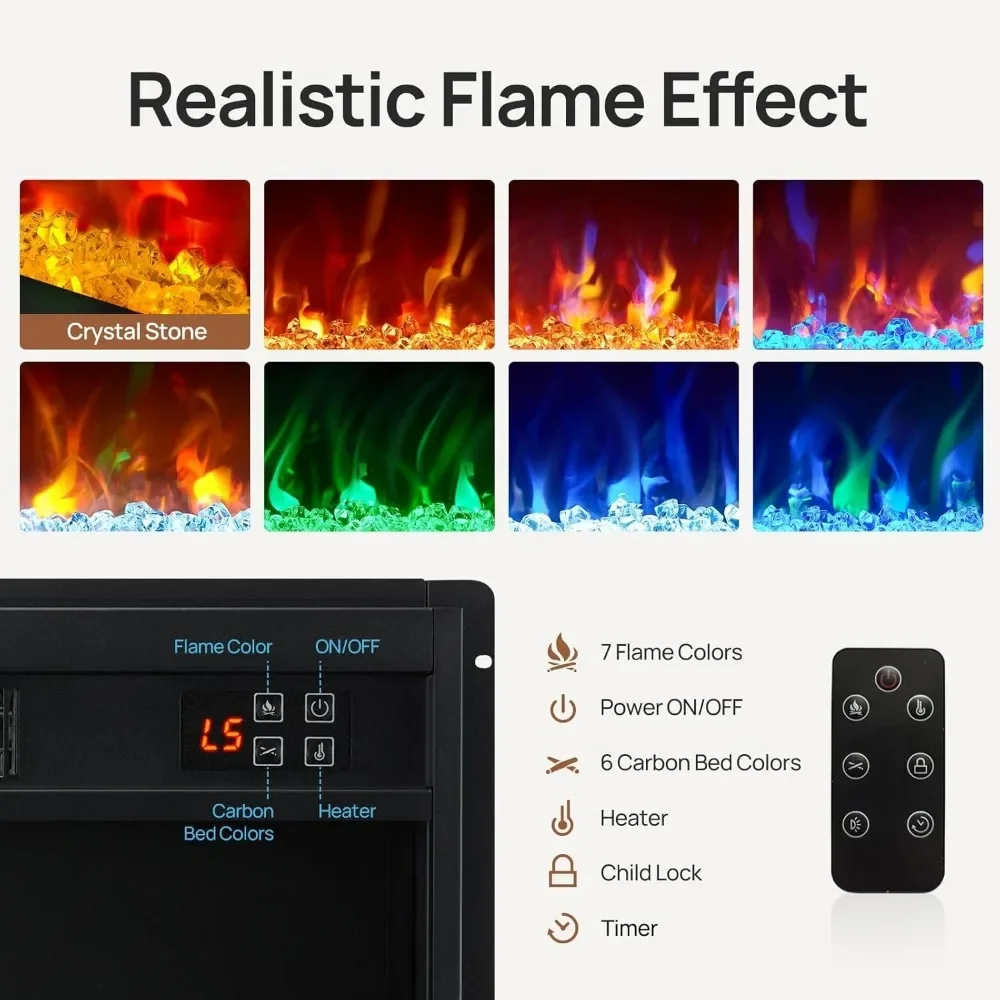 • 26 inch Inset Electric Fireplace: The color-changing electric fireplace offers 14 adjustable temperature levels, ranging from 62°F to 90°F, with overheating protection and a timer function to ensure your family’s safety. It features realistic crystal stones, 7 flame colors, 5 ember bed colors, and 3 brightness settings. The dancing flames and burning effect create an authentic fireplace ambiance, enhancing the atmosphere in your living room