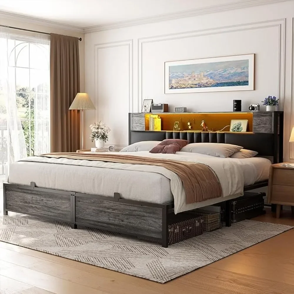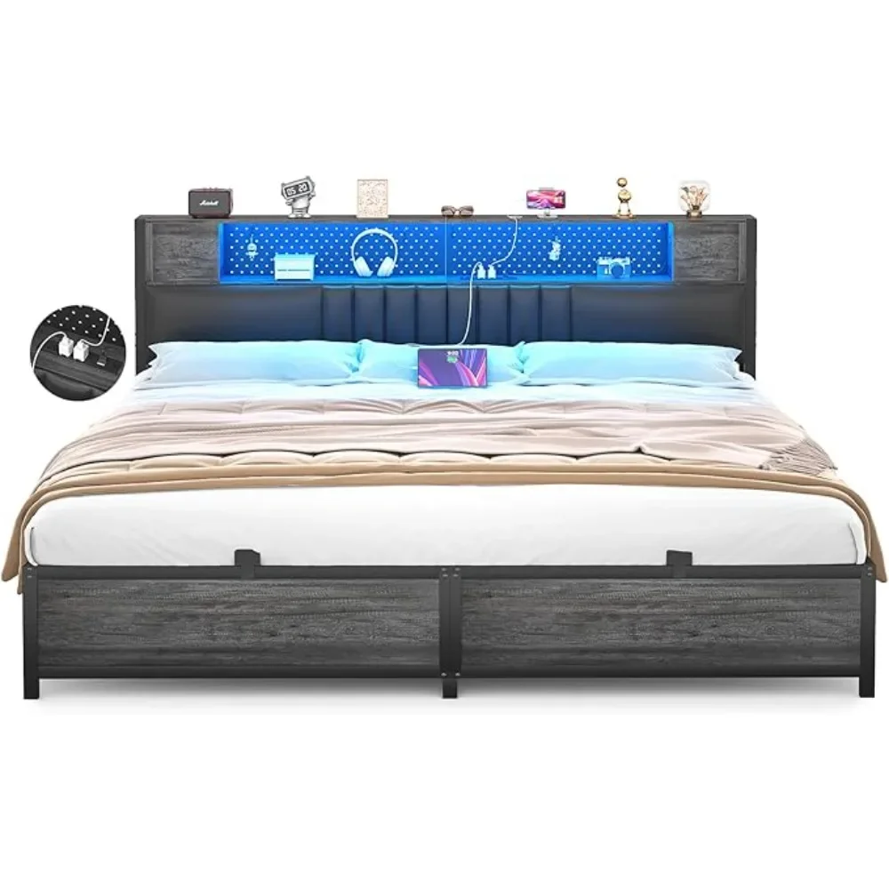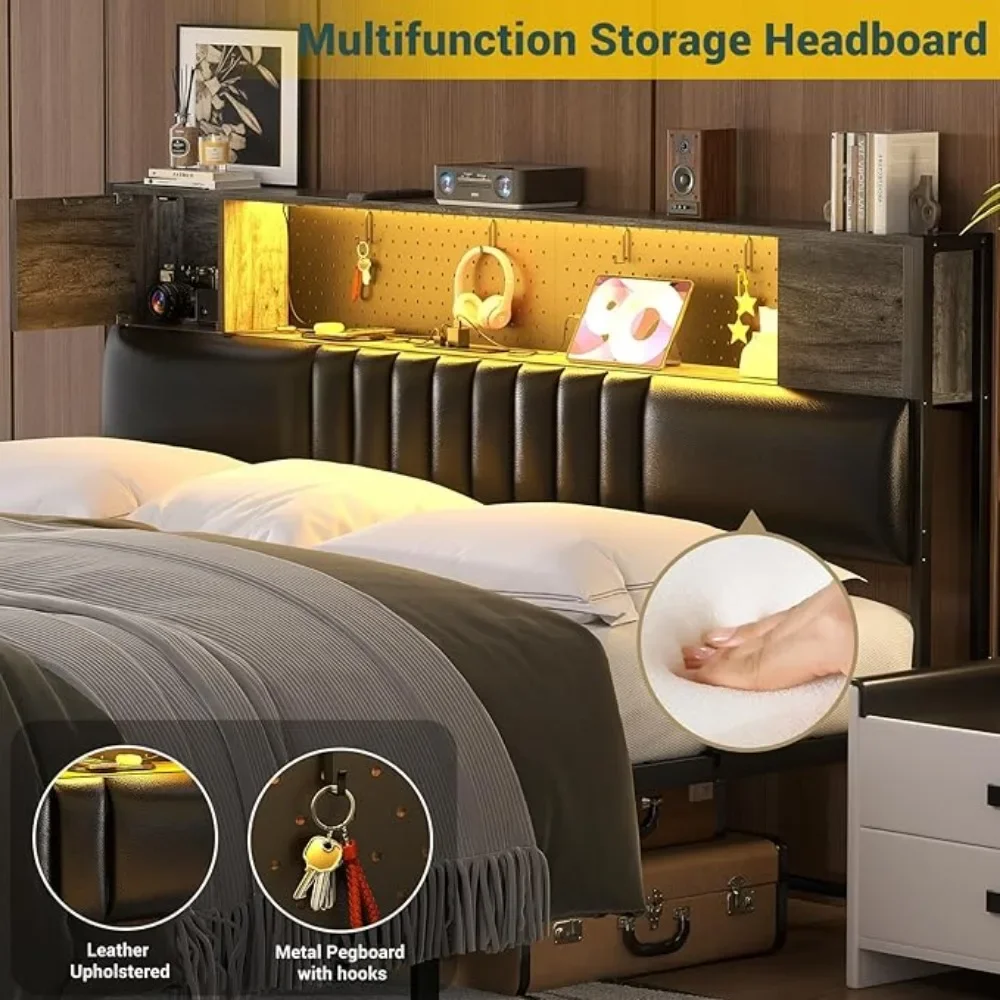 - Thoughtful Headboard with Storage Cabinet -Our well-designed headboard of the upholstered bed frame features a thoughtful design with large open storage shelves and two private storage cabinets with doors, allowing for easy organization of your phone, books, decorations, or some odds. Our storage headboard is equipped with a metal pegboard to catch any magnetic decorations, as well as includes four hooks to hang headphones or others you like.