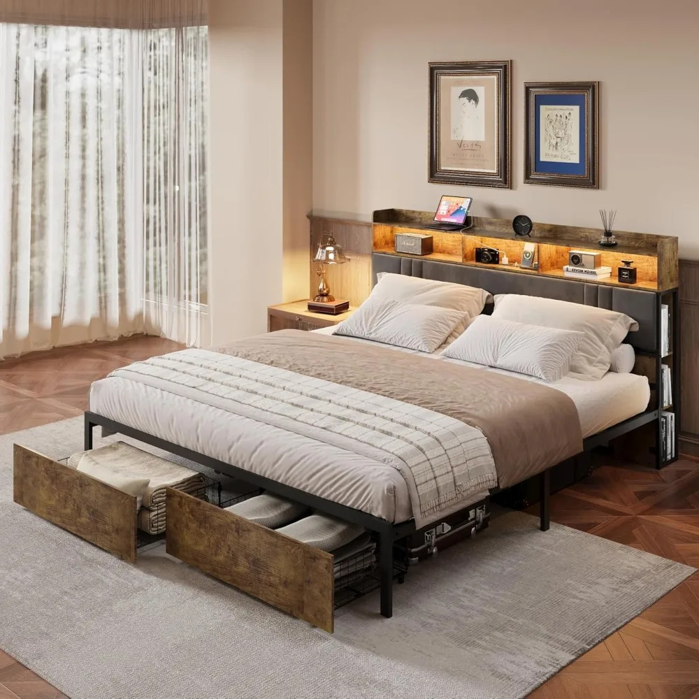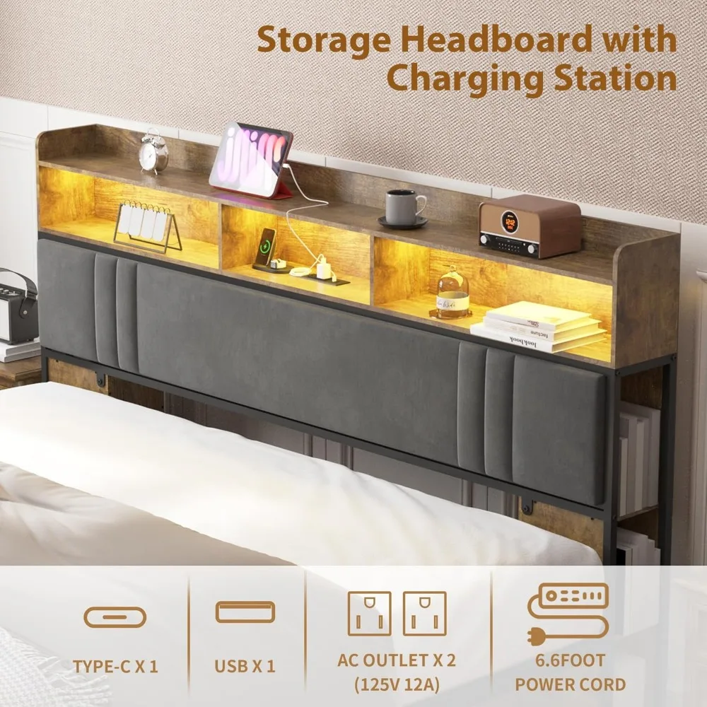 - 【STORAGE HEADBOARD WITH CHARGING STATION】:Metal Platform Bed Frame with 2-tier Storage Headboard with Built-in Charging Station, Built-in 2 American Outlets, 1 USB Port and C-type Connector, Convenient for you to Charge your Electronic Devices Wwhile you are Resting.The 2-tier Headboard adds More Storage Space for Electronic Devices, alarm Clocks, Decorative Items, Books and More.