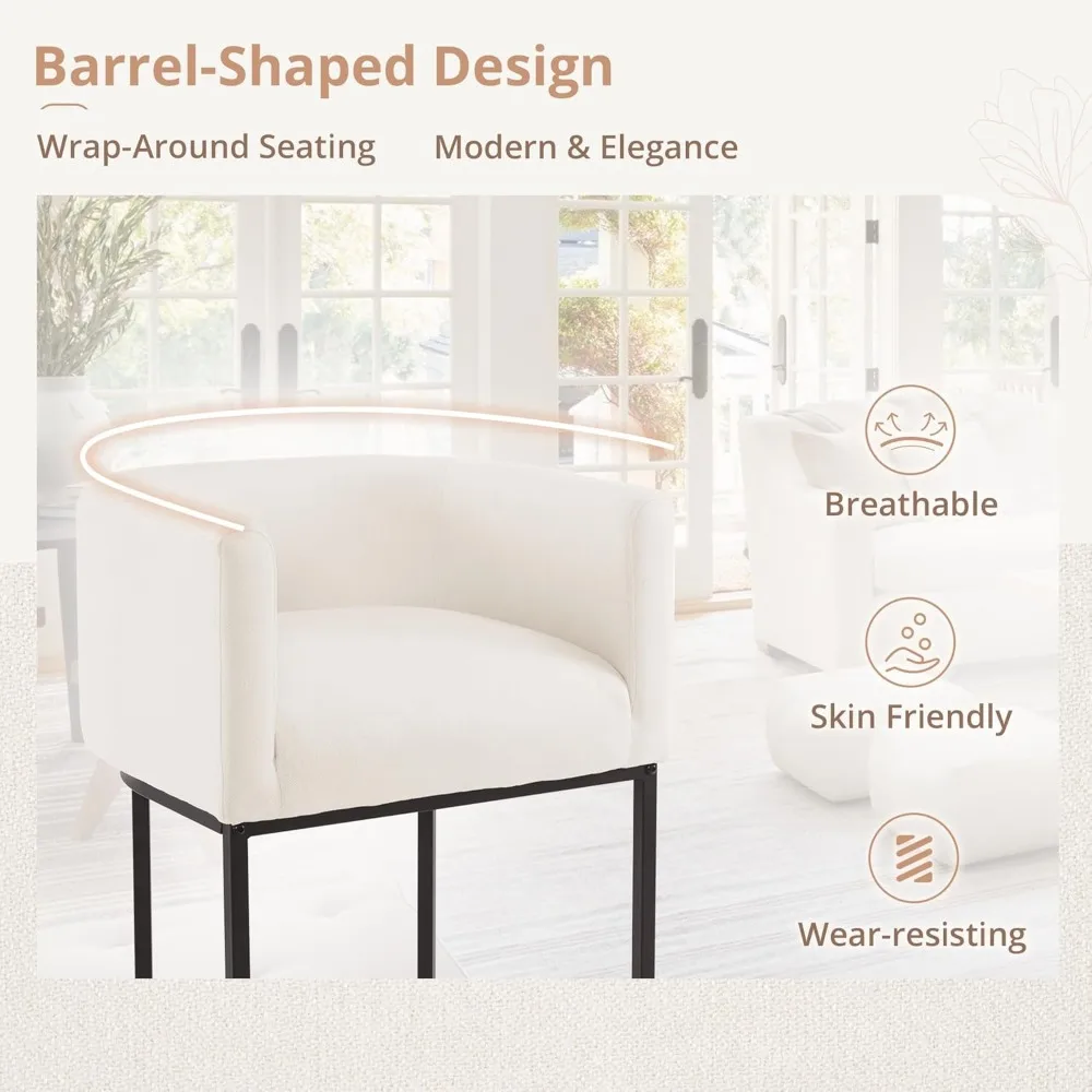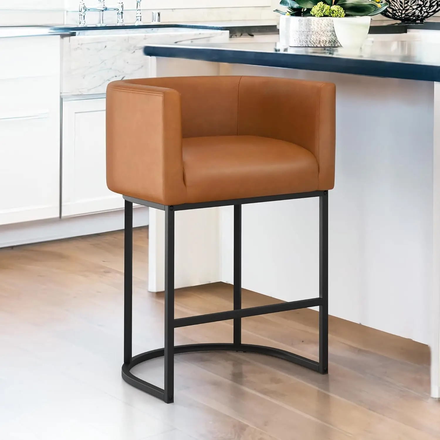 The stools’ sleek, barrel-shaped silhouette exudes a modern aesthetic that complements any décor. The black metal frames add a touch of industrial chic, creating a striking contrast against the warm upholstery. The neutral color palette of yellowish brown and beige seamlessly blends with a wide range of color schemes.