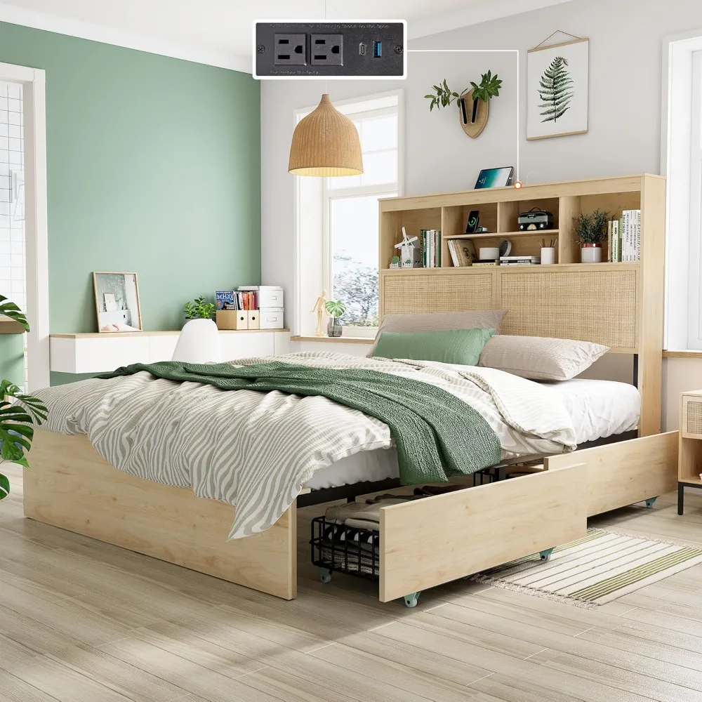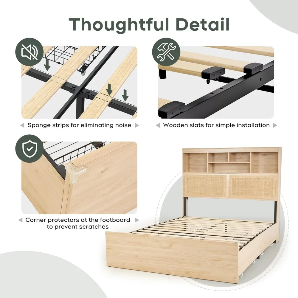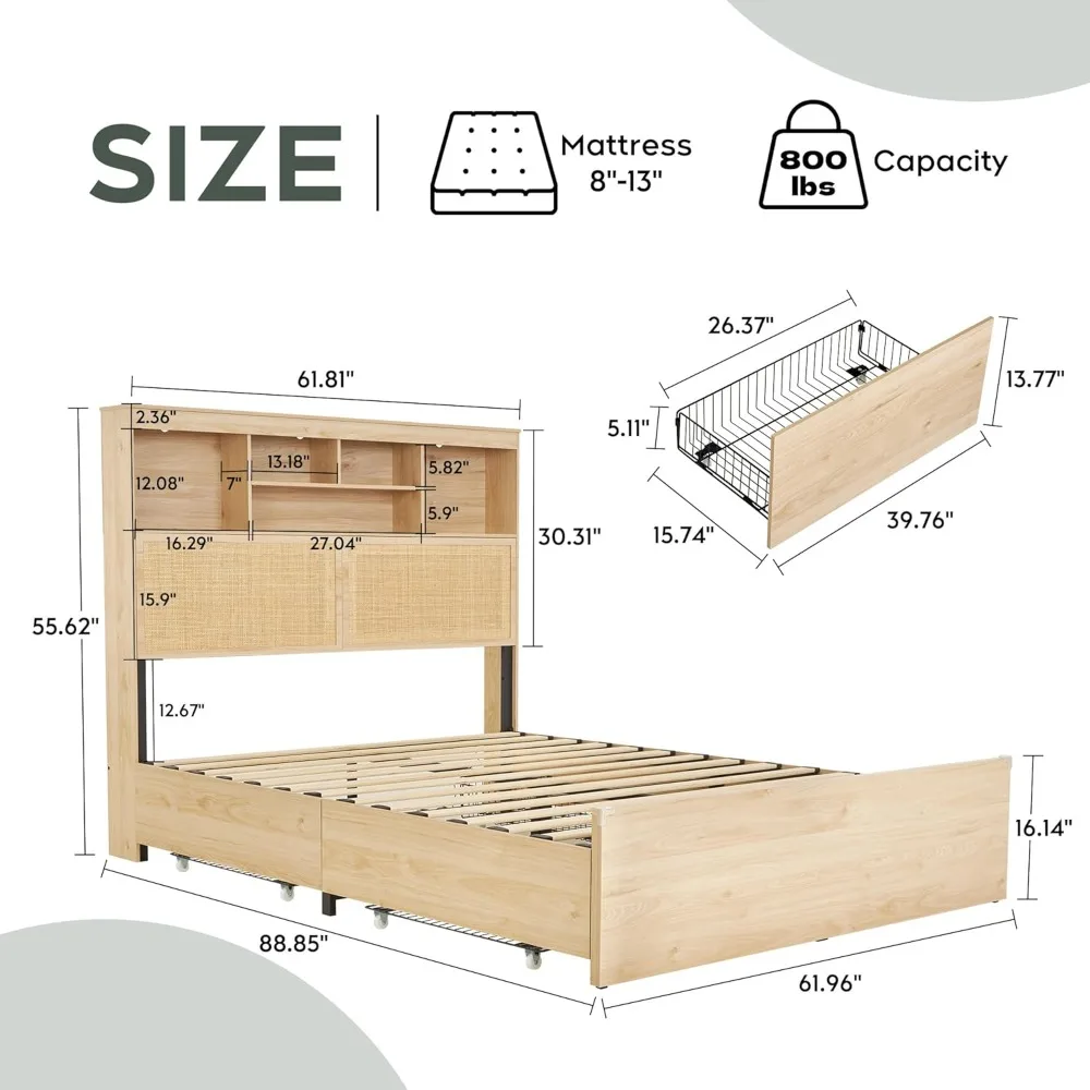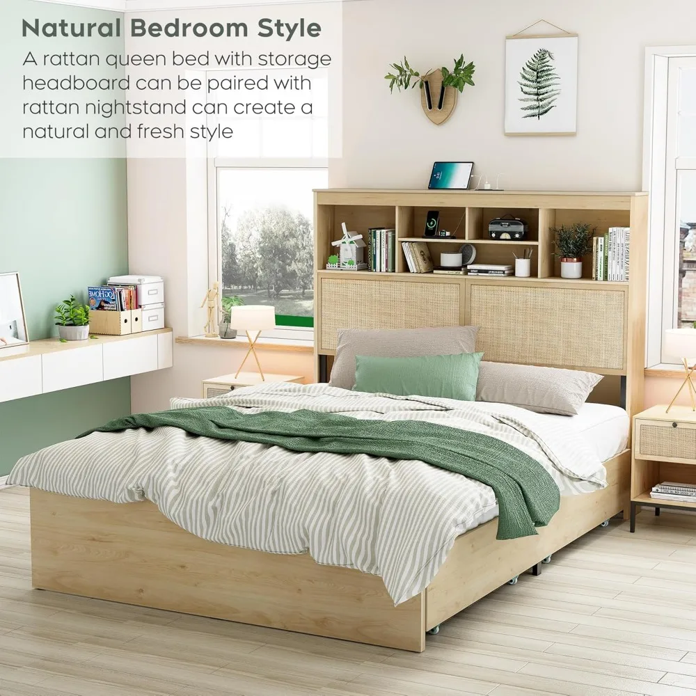 Queen Size Bed Frame with 55.6″ Natural Rattan Storage Headboard, Wooden 4 Storage Drawers & Charging Station, Metal Bed Frame