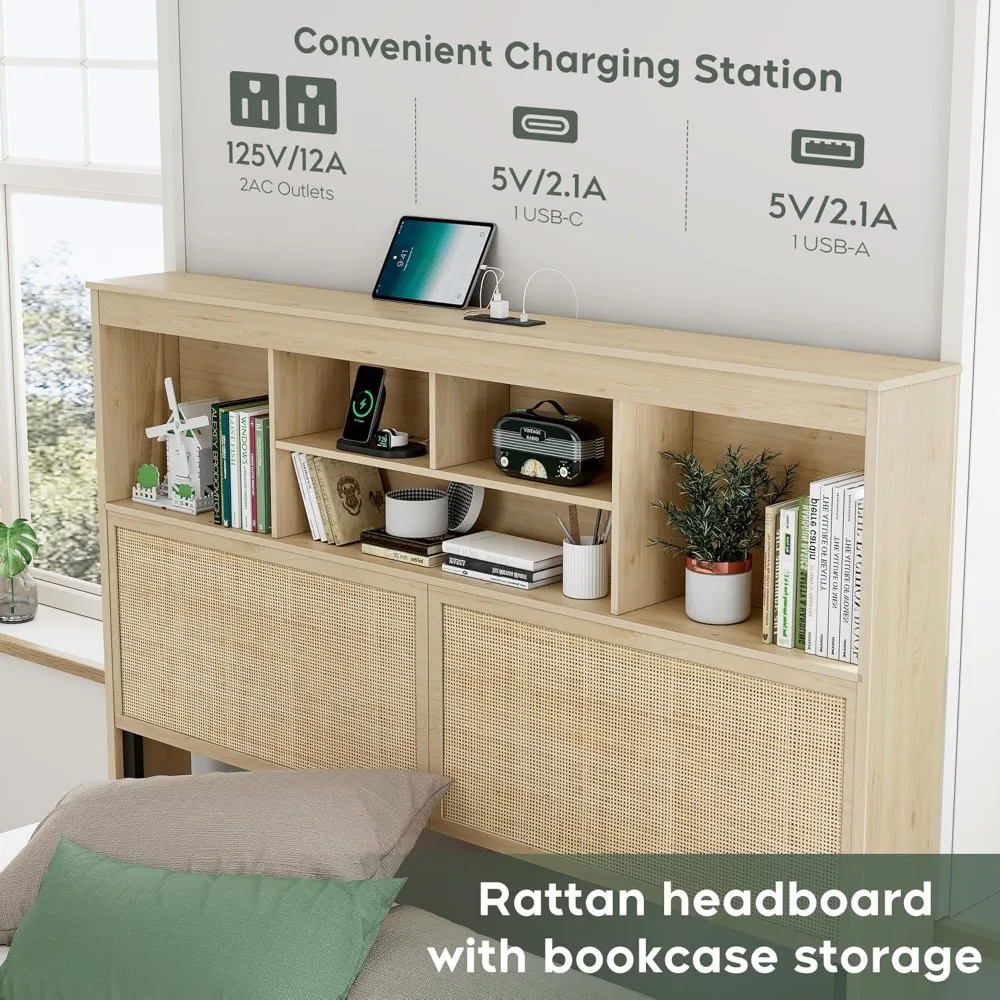 • The headboard of the bed frame is made of hand-woven natural rattan, the wooden finish makes this bed very natural and clean. The equipped headboard bookshelf storage and charging station can meet bedroom storage needs, allowing for easy charging and placing of daily items.