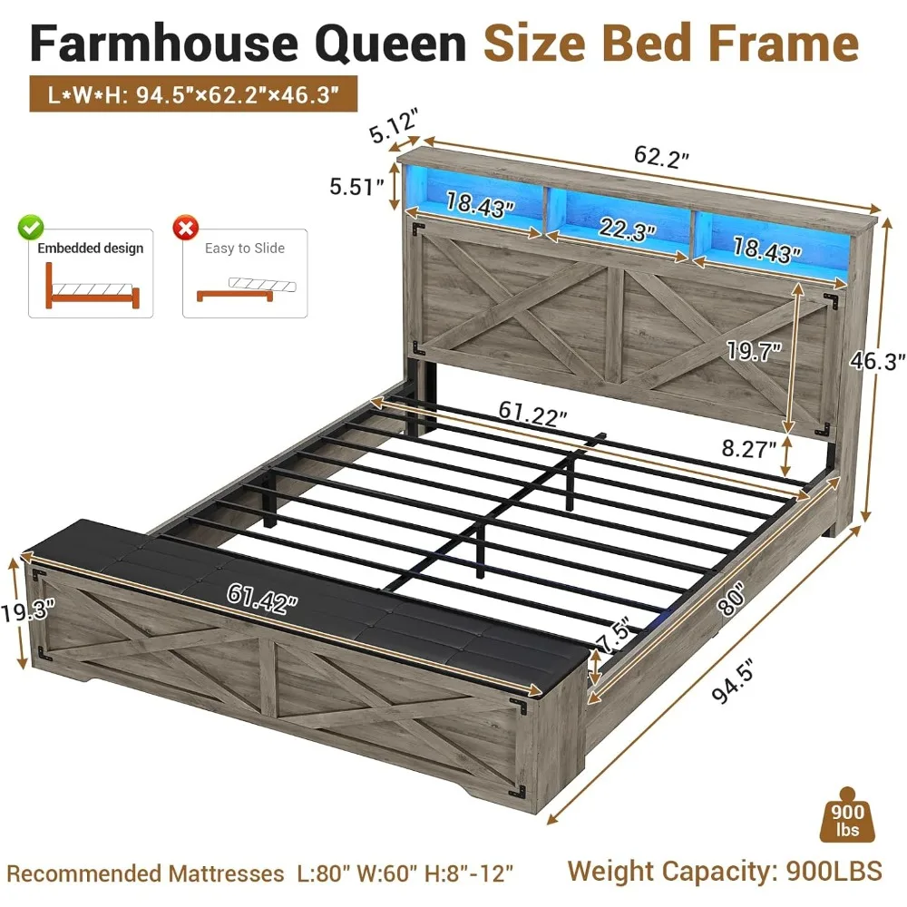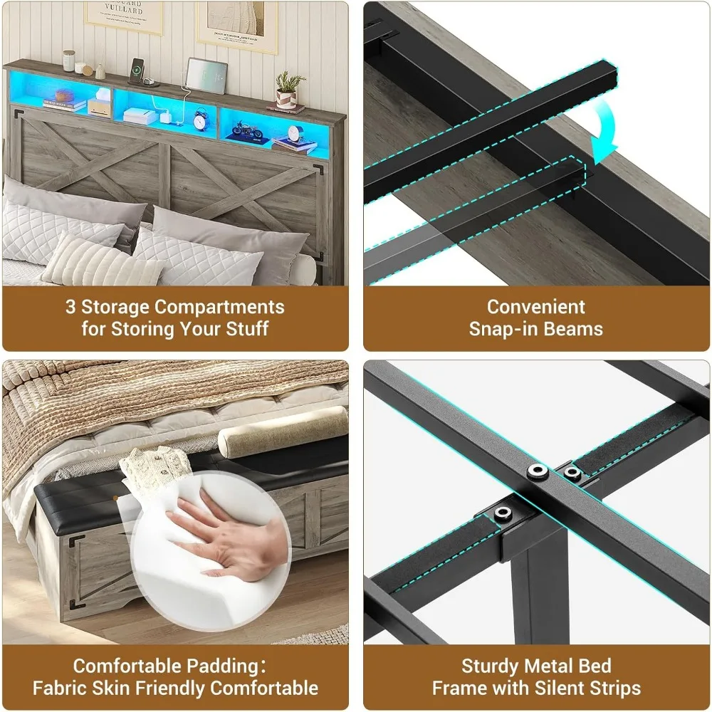 Queen Size Bed Frame with Storage Ottoman, Farmhouse Bed Frame with Charging Station and Led Light, Headboard with Storage Rack
