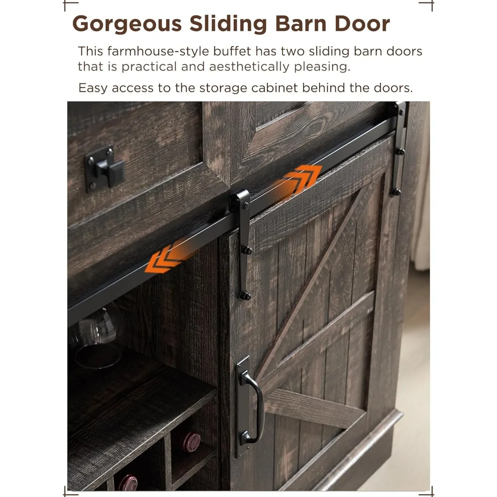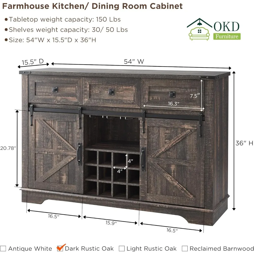 Wine Bar Cabinet W/Sliding Barn Door, 54″ Kitchen Coffee Bar Cabinet W/Wine & Glass Rack, Shelves, 3 Drawers, Buffet Sideboard